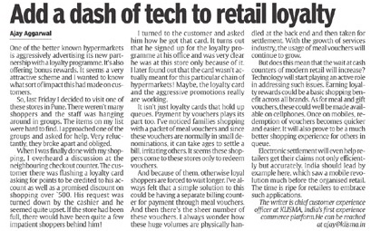 But does this mean that the wait at cash counters of modern retail will increase? Technology will start playing an active role in addressing such issues. Earning loyalty rewards could be a basic shopping benefit across all brands. As for meal and gift vouchers, these could well be made available on cellphones. Once on mobiles, redemption of vouchers becomes quicker and easier. It will also prove to be a much better shopping experience for others in queue.